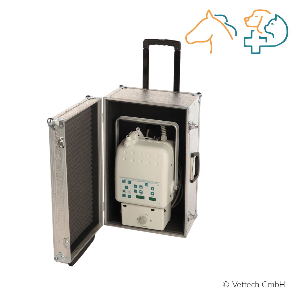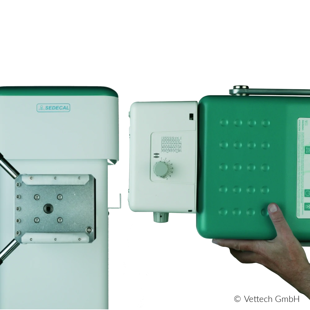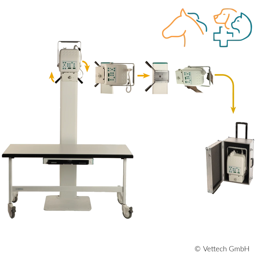 Das Röntgengerät kann für den Mobileinsatz einfach aus der Halterung genommen werden. Der Transportkoffer mit Haltegriff und Rollen sorgt für eine einfache und sichere Mitnahme.